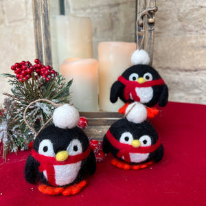 Penguin is hand crafted from New Zealand wool and is kept warm with his very own red woollen scarf. He has a string attachment to hang him up with.