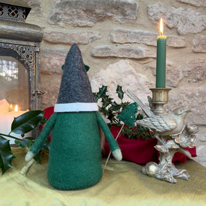 Felted Wool Gnome with grey hat, hand sewn with a snowflake and appliquéd holly and berries. Father Christmas has a faux fur beard and is holding a detachable Christmas tree in his hand. The tree is decorated with hand sewn beads.