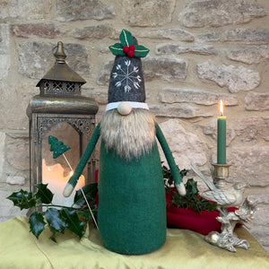 This felted wool gnome features a faux fur beard and wears a grey hat adorned with a hand-stitched snowflake and appliquéd holly with berries. He holds a removable Christmas tree embellished with hand-sewn beads.