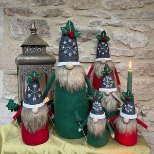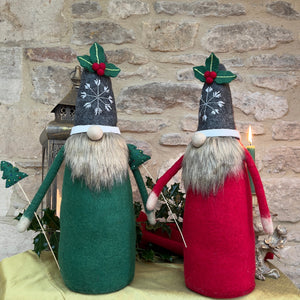 This felted wool gnome features a faux fur beard and wears a grey hat adorned with a hand-stitched snowflake and appliquéd holly with berries. He holds a removable Christmas tree embellished with hand-sewn beads.