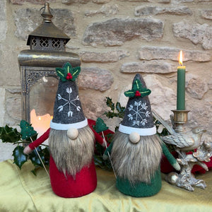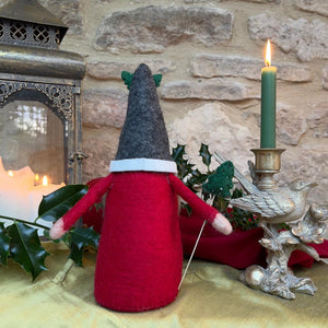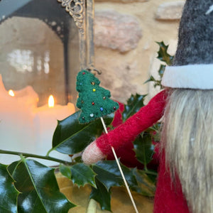 Felted wool Gnome has a faux fur beard wearing a grey hat with a hand sewn snowflake and appliquéd holly and berries. He is holding a detachable Christmas tree in his hand. The tree is decorated with hand sewn beads.