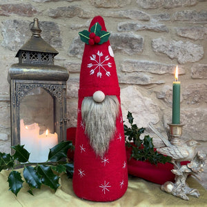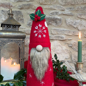 This Father Christmas gnome is crafted from felted wool, featuring a soft faux fur beard and delicately hand-stitched snowflake details on both hat and body. The hat showcases appliqué accents of holly, and berries, while the back is adorned with an exquisite appliquéd Christmas tree embellished with beads.