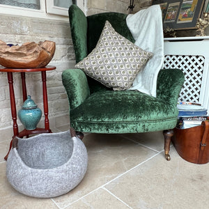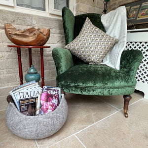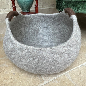 Elegant, expertly handcrafted pure wool felted storage basket, featuring rich brown wool handles.