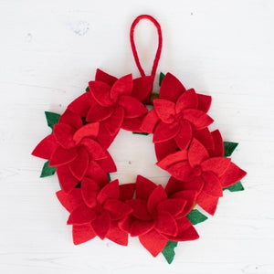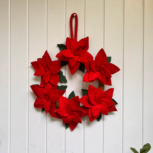 This elegant 'Poinsettia' wreath, crafted from felted wool, is ideal for enhancing your home’s walls or doors. Each flower is carefully handmade, accompanied by green leaves that beautifully accentuate the design. A classic piece you’ll look forward to displaying annually.