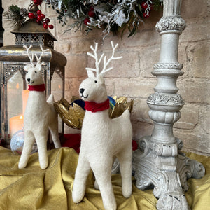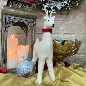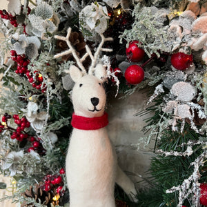 Standing proud with his wired antlers and a red scarf, our reindeer is hand crafted using felted wool and a soft filling.