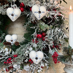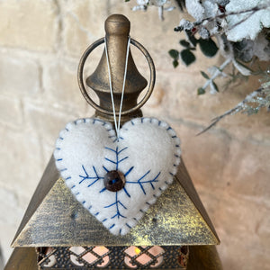 Each Christmas Heart decoration is hand crafted, hand embroidered in blue; the look is completed with a decorative button.