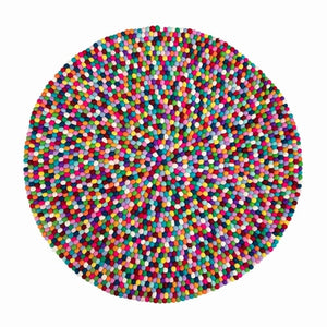 It takes a long time to learn the craft of felt ball making; dying the wool, sizing each ball by pulling tufts of wool by hand and then rolling to create each perfectly shaped and sized ball. The rugs are then hand stitched.