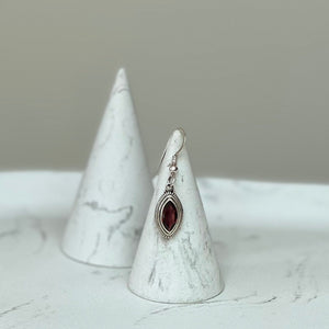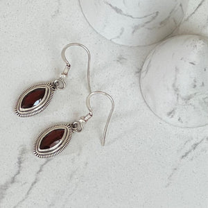 A hand crafted silver setting complements the deep red of the oval garnet earrings. The birthstone for January, garnet also inspired many legends and popular associations with love, friendship, light, and vitality.