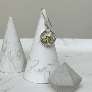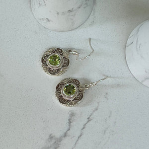 This beautiful pair of earrings feature sparkling round Peridots within an intricate and detailed hand crafted silver setting. A fabulous pair of earrings to add a pop of colour to your outfits and take you from day to night.