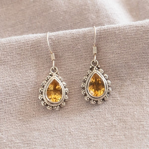 Stunning Silver & Citrine earrings, a 'teardrop' design, beautifully cut. The quality of the Citrine is wonderful; a gorgeously rich yellow and the hand worked detail of the silver is that of a real craftsman.